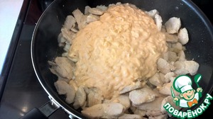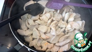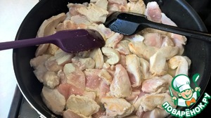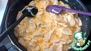 Выливаем соус в сковороду с курицей