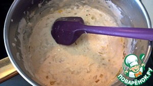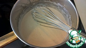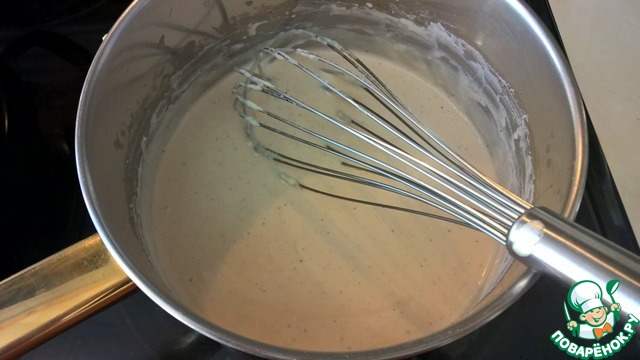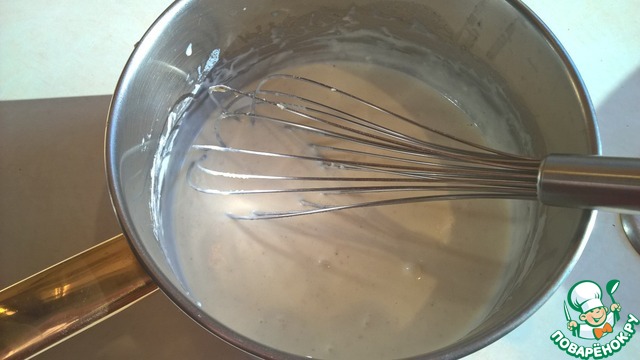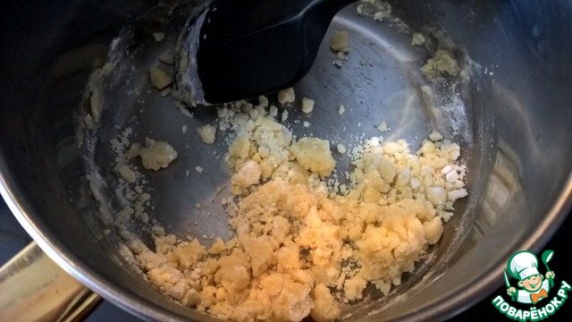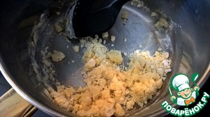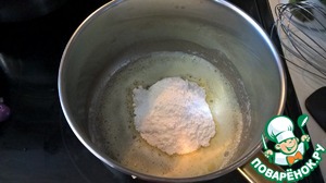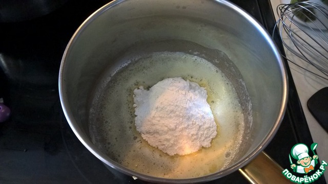 Постоянно помешивая силиконовой лопаткой прогреваем муку со сливочным маслом до появления характерного орехового запаха. При этом смесь приобретает кремовоый цвет и пропадает запах сырой муки