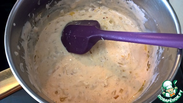 Добавляем пассерованый лук в соус и тщательно перемешиваем. За счет лука соус приобретает желтовато-кремовый оттенок.