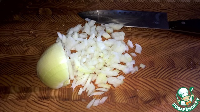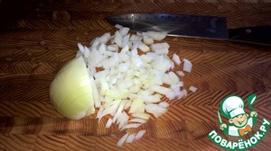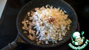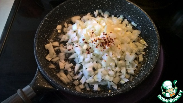 Пассеруем на смеси оливкового (2 ст. л.) и сливочного (30 г) масел с добавлением красного жгучего перца. Пассеруем на среднем огне до тех пор пока лук не приобретет желтовато-кремовый цвет - ни в коем случае не давем ему подгореть. Когда лук готов - снимаем его с огня и отставляем в сторону