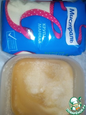 В стакан наливаем 2 ст. л. соевого соуса, доливаем воду или постое молоко до отметки 250 мл. В этом растворе замачиваем манную крупу. Ненадолго, пока делаем остальные приготовления.