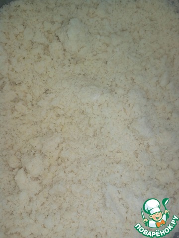 Холодное сливочное масло порезать на кусочки и перетереть с мучной смесью в крошку. -