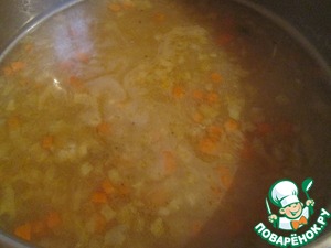 Из готового бульоны вынуть рыбу, бульон процедить. Караси нам не понадобятся, а карпа нужно разобрать - тщательно отделить мясо от костей. Теперь " собираем " суп. Процеженный бульон доводим до кипения, добавляем зажарку, варим минуты три. Затем добавляем картофель с икрой. Доводим до кипения и сразу снимаем с огня, солим по вкусу, кладем кусочки карпа.