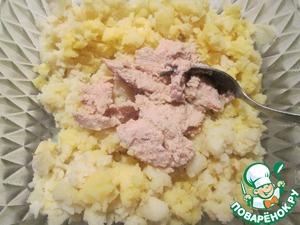 Испеченный картофель почистить, размять вилкой и смешать с икрой.