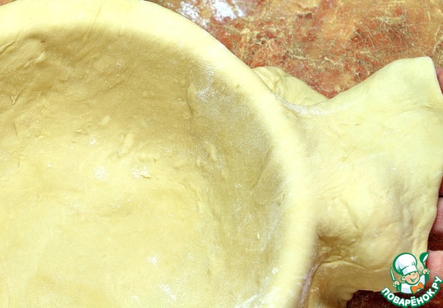 Тесто раскатаем в тонкий лист до такого размера, чтобы края теста свисали из формы и могли накрыть наш пирог сверху, аккуратно перенесем тесто на форму.