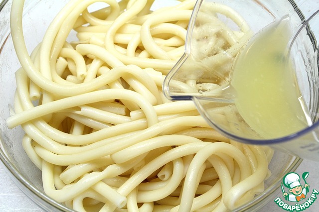 Отварим макароны до состояния аль-денте, когда макароны остынут добавим к ним лимонный сок и перемешаем. Заранее включим духовку.