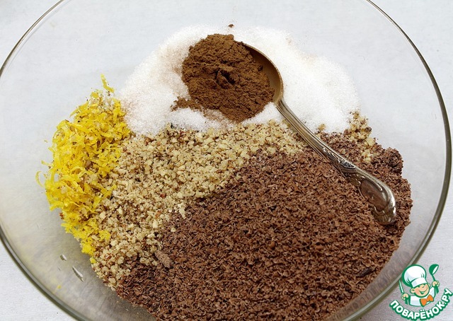 Смешаем тертый шоколад, ореховую массу, сахар, корицу, ванилин от "Dr. Oetker" и лимонную цедру.