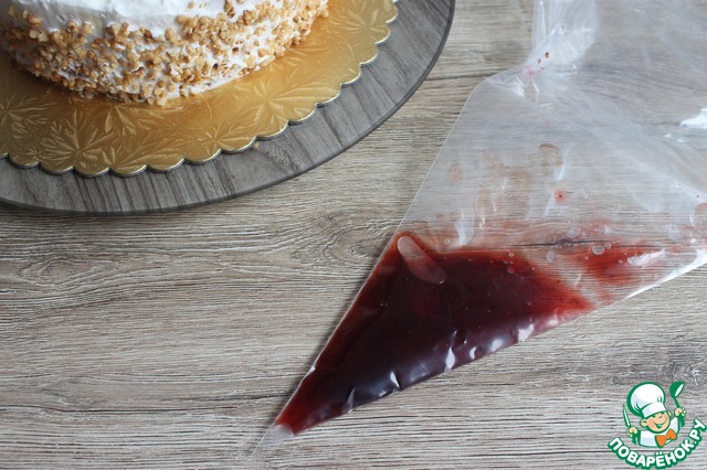 Далее берем кулинарный мешок и накладываем джем. Если у вас он густой, то разогрейте его в микроволновке. И делаем произвольные полоски на торте.