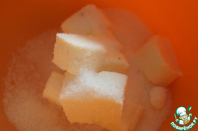 Сначала нужно приготовить тесто. Для этого масло следует достать заранее, чтобы оно стало мягким и послушным. Выложить масло в чашу, добавить сахар и взбить с помощью миксера.