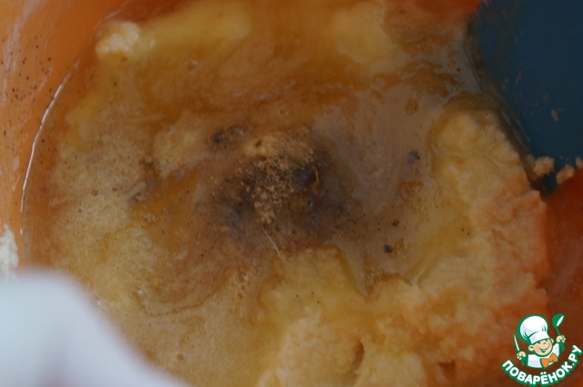 Мед растопить (если он твердый), но не кипятить. Добавить к взбитой масляной массе. Сюда же добавить все специи. Специи можно менять под свой вкус. Хорошо взбить.