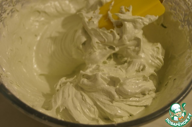 Тонкой струйкой влить готовый сироп, достигший 110 градусов в яблочно-белковую массу, не переставая тем временем взбивать. (важно не переварить, иначе сироп потемнеет). По желанию добавить зеленый гелевый пищевой краситель (1-2 капли). Готовая масса должна увеличиться вдвое, стать блестящей и густой (хорошо держит форму).