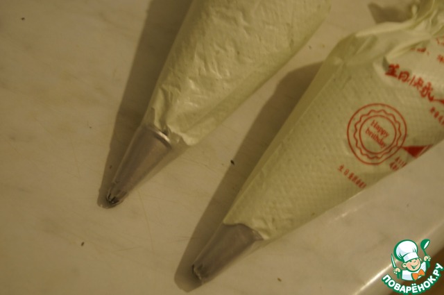 Подготовить насадки для кондитерского мешка и сами мешочки. Сразу, после взбивания, переложить зефирную массу в мешочки. У меня насадки "закрытая звезда": одна побольше, другая поменьше.