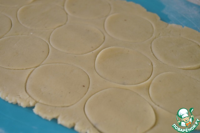 Отдохнувшее тесто разделить на 3 части. Взять одну и раскатать в пласт толщиной 2-3 мм. Выложить заготовки на противень, застеленный пергаментов и выпечь в духовке, разогретой до 180 градусов, около 10-12 минут. Готовые заготовки остудить полностью.