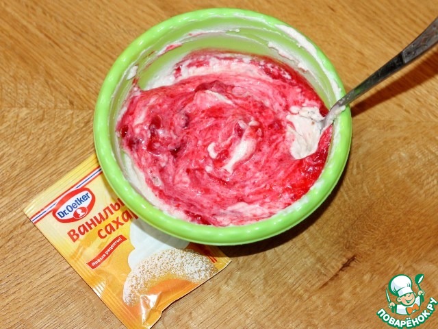 6. Приготовим начинку. Смешиваем джем с творогом, растопленным и охлажденным сливочным маслом, яичным белком и ванильным сахаром. Джем можно положить по вкусу. У меня протертая с сахаром малина.