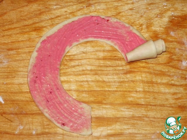 9. Оставшейся круг разрезать, смазать начинкой и скатать. Положить заготовку в корзиночку. Из обрезков теста у меня получилась 8 булочка.