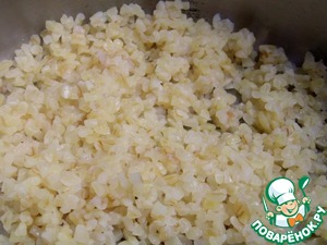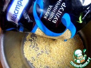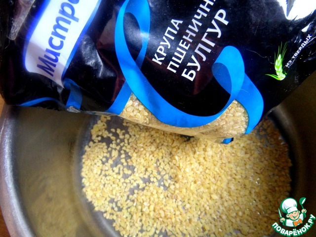 Для начинки насыпать булгур от ТМ"Мистраль" в кастрюлю, залить водой и поставить на огонь.