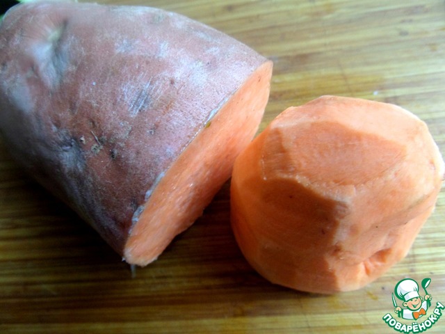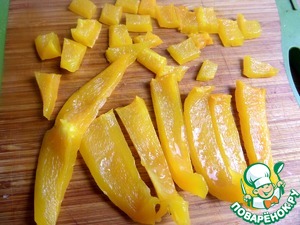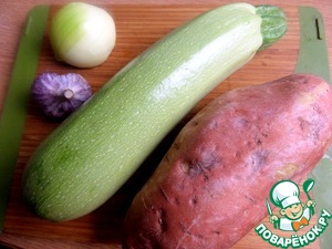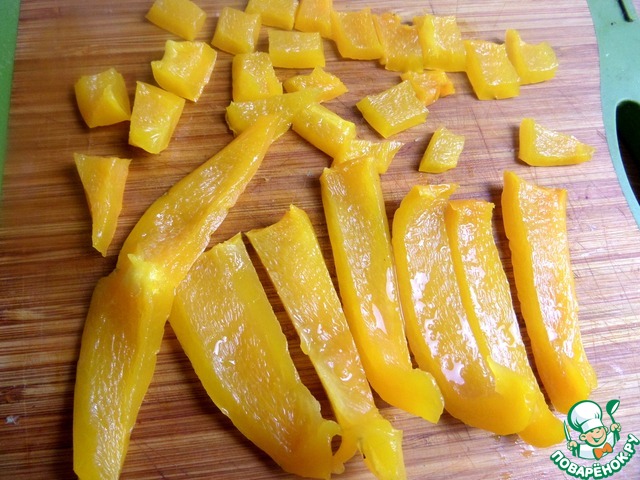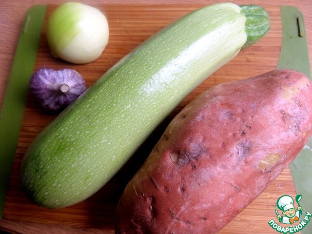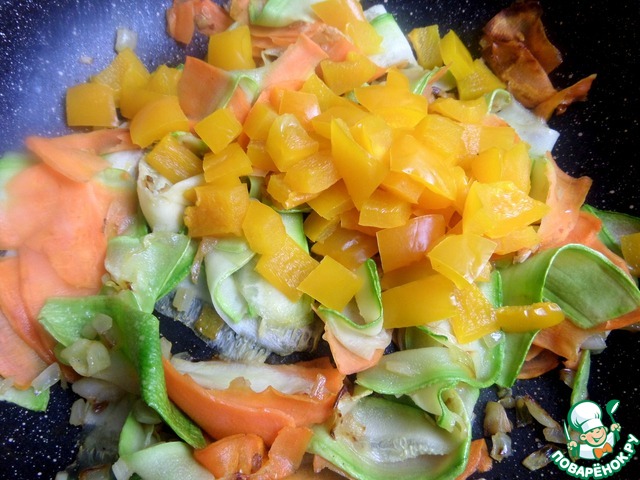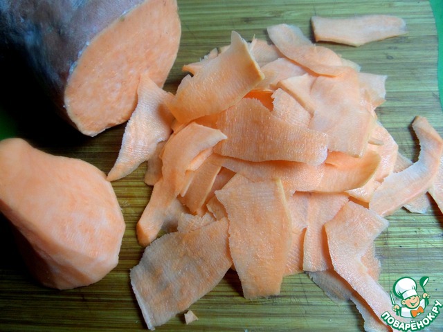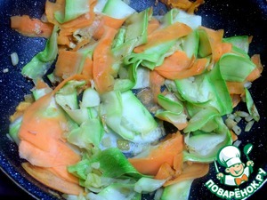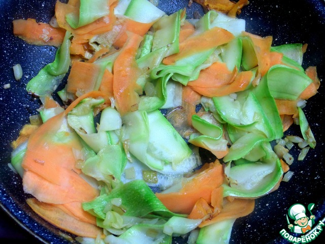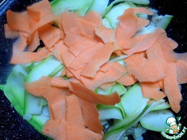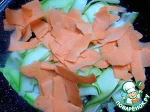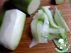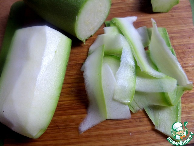 Молодой кабачок нарезать слайсами овощечисткой прямо с кожицей.