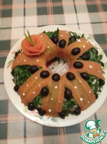 Взять тарелку, на середину поставить стакан, вокруг него выложить салат. Для украшения венка достаточно плотно укладываем петрушку по поверхности салата. Наряжаем наш веночек: нарезаем морковь на очень тонкие ломтики овощечисткой. Укладываем ленты моркови через равные промежутки.