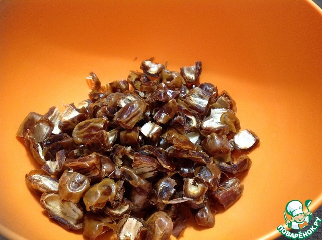 Финики крупно порезать. Орехи пожарить на сухой сковороде и крупно порубить.