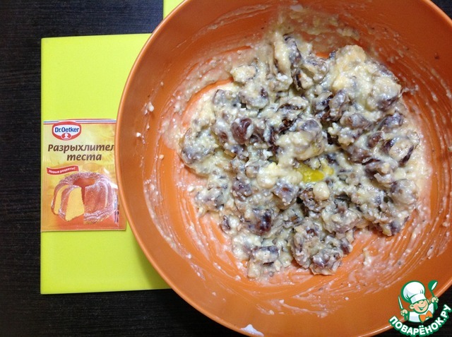 В миску добавить сахар, мандариновый джем (или другой с ярко выраженным вкусом), рубленные орехи, яйцо, творог, растопленное сливочное масло, апельсиновый ликер, финики и хорошо перемешать. Добавить просеянную муку с разрыхлителем (Dr. Oetker).