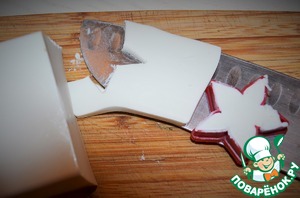 Фетаки нарезать на тонкие пластины, формочками вырезать тематические фигурки.