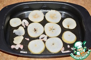 Выложить на дно формы лишний жир от птицы (порезать) и 1 грушу, порезанную кружками.