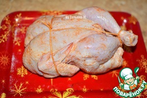 Цыпленка перетянуть жаропрочной нитью, фиксируя ножки и крылья.