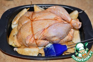 Кисточкой хорошо промазать соусом птицу со всех сторон, груши в том числе.