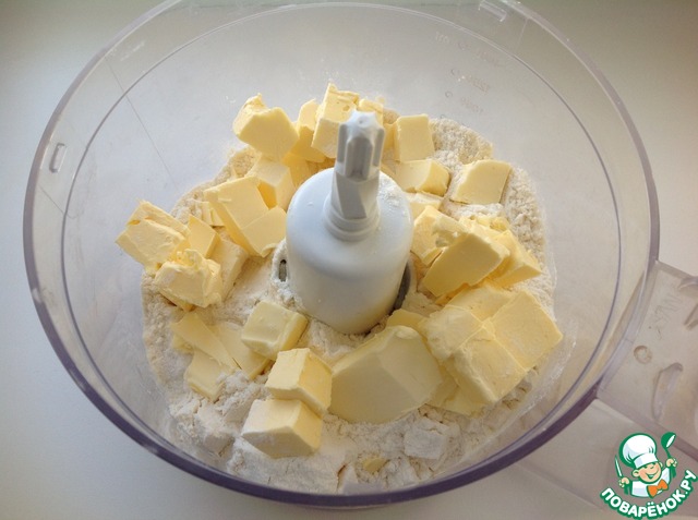В кухонный процессор добавить муку, соль и нарезанное на кубики холодное сливочное масло.