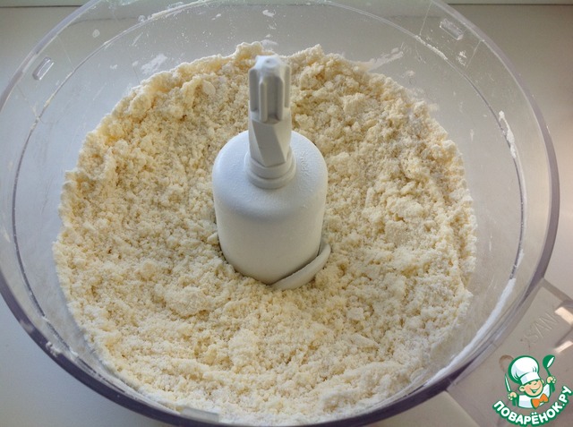 Пробить до состояния грубой крошки. Нож удалить, добавить 3 ст. л. холодной воды и замесить тесто. Если тесто будет рассыпаться, добавить еще немного воды.