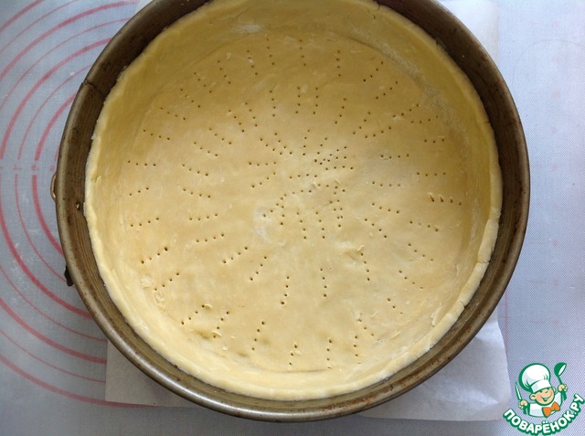 Осторожно накрыть тестом форму. Лишнее тесто обрезать, дно наколоть вилкой. Форму с тестом убрать в морозильную камеру на 10-15 минут. Разогреть духовку до 180 градусов.