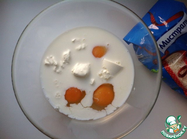 В миску добавить яйца, сливки, молоко, мягкий сливочный творожный сыр.