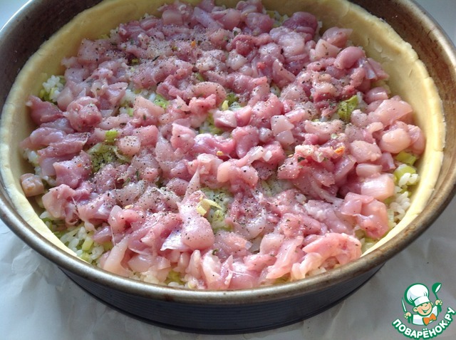 Сверху выложить мясо курицы. Посолить и поперчить.