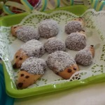 Ежиков сложить на противень, застеленный бумагой для выпечки и поставить в разогретую духовку. Выпекать при температуре 180 градусов примерно 12-15 минут. Готовое печенье полностью остудить.