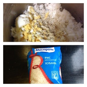 К отварному остывшему рису добавить мелко нарубленные яйца, соль, молотый черный перец. -