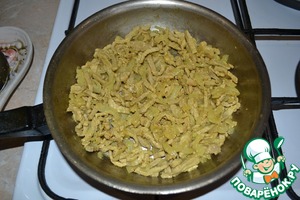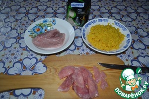 Пластинки мяса тонко порезать, лук нарезать соломкой.