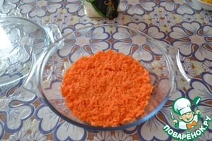 На дно выложить морковь, разровнять, прижать, смазать майонезом. -