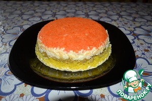 Перед подачей чашу с салатом накрыть плоским блюдом. Осторожно перевернуть, чтобы верхним слоем оказалась морковь. Скажу честно, что дальше что-то ещё делать с салатом мне вовсе не хотелось, я имею ввиду посыпку из тёртого желтка... салат и так был просто великолепен! Но, надо идти до конца, раз я захотела воплотить в жизнь забытое старое!