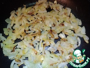 Обжариваем лучок, пока варится картошка. Нарезаем огурчик небольшими кусочками. Параллельно занимаемся начинкой.