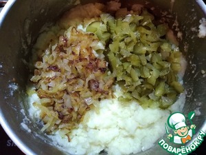 К пюре добавляем лук и огурцы. Просто перемешиваем ложкой. Если очень горячо пока, то оставляем немного остыть перед добавлением муки. Добавляем просеяную муку постепенно, пока тесто не станет вязким. Потребуется около стакана муки.