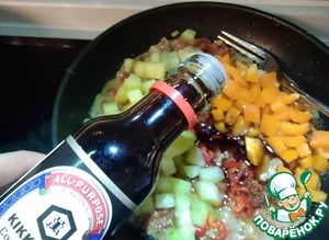 Слегка обжарить фарш. Добавляем к нему порезанные перцы, кабачок, соевый соус. Он придает пикантность, подчеркивает вкус каждого ингридиента и делает вкус ярким и гармоничным. Обжариваем начинку на среднем огне до выпаривания жидкости.