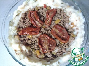 2/3 пюре с луком и огурчиками распределяем по форме в виде чаши. Выкладываем начинку из фарша. Сверху кладем дольки вяленых томатов. Закрываем пирог оставшимся пюре. Прокалываем в нескольких местах. Ставим в разогретую до 180° духовку минут на 50. Зависит от формы, которую вы используете, и высоты пирога.