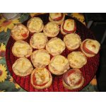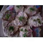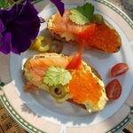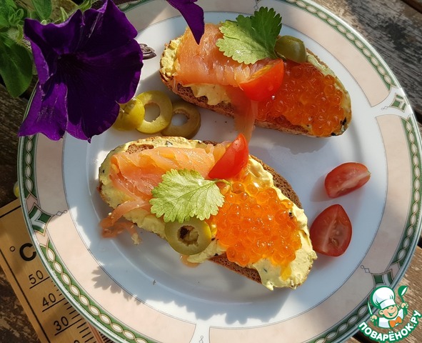 Поджаренные кусочки ароматного хлебушка, в сочетании с творогом и ароматом лимона, украшенные кусочками соленой семги, красной икрой, помидоркой и пикантной оливкой - не оставят никого равнодушным.