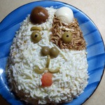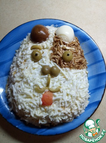 Так как Новый год у нас проходит во время Рождественского поста, делаю такой салат в постном варианте. Вместо яиц берем 3 отварные картофелины, а обычный майонез заменяем постным майонезом. Желтый цвет от приправы с куркумой. Можно посыпать паприкой, получатся ярко рыжие пятна. И вот такой забавный Рекс вышел, как из польского мультфильма.
