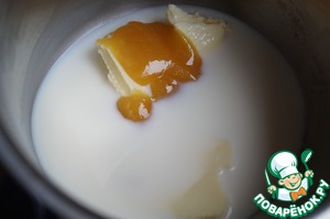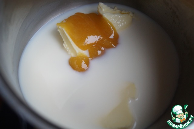 В сотейник вылить молоко, добавить мед и сливочное масло.