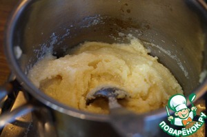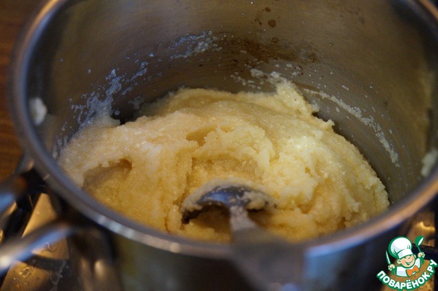 Прогреваем молочно - медовую смесь на огне, но не доводим до кипения. Затем помешивая всыпаем в молоко манную крупу. Получается густая манная смесь. Накрываем сотейник крышкой и оставляем на слабом огне на 5 минут. Следите чтоб не подгорело.