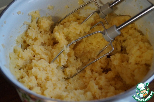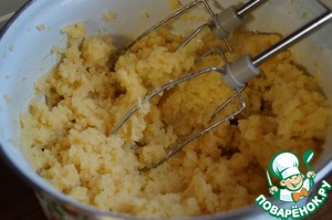 Манку остудить, добавить 2 яйца и взбить миксером. Получилось манное тесто.
