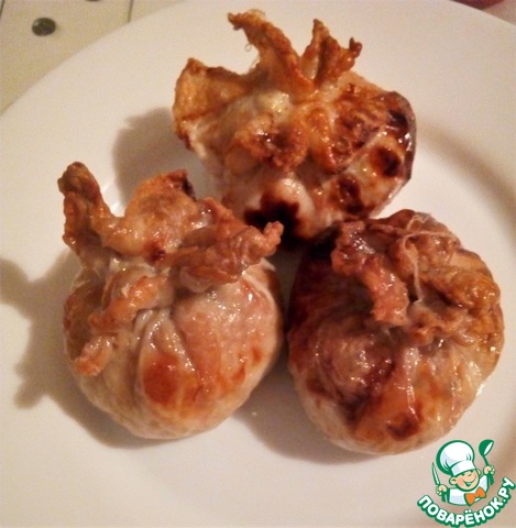За 10 минут до готовности разрезаем пакет для запекания и раскрываем его. Образовавшимся соком поливаем наши фаршированные мешочки и возвращаем в духовку подрумяниться.