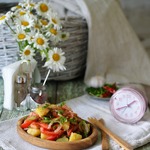Отвариваем картошку в мундире или запекаем в микроволновке. Я запекал (1100 ватт - 3 мин). Пока готовится картошка - нарезаем помидор крупно и выкладываем в миску