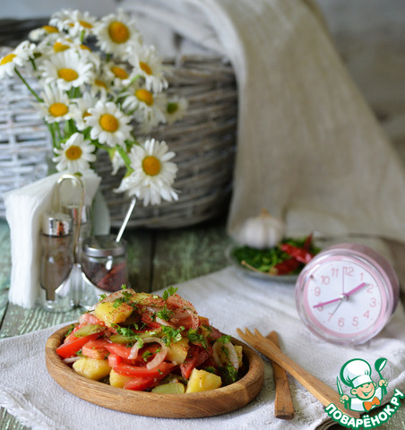 Это незамысловатый салатик, который я очень люблю. Он делается из подручных продуктов, которые, как правило, всегда есть. Несмотря на простоту, он обладает довольно интересным вкусом. Картофель и подсолнечное масло смягчают остроту жгучего перца и лука, а кислота соленого огурчика нейтрализует жирность масла. Петрушка придает некую ароматную нотку и все вместе создает довольно интересный букет. Наличие теплой картошки тоже придает некий колорит, хотя можно подавать его и холодным. Кроме этого за счет картошки - салатик этот довольно сытный и может быть использован как полный завтрак, обед или ужин. Он неплохо подходит как гарнир к мясным блюдам. Я не смог найти похожий салат на этом сайте, но задача поиска похожего салата не очень легка, поскольку он не имеет уникального названия. Я называю его деревенским, поскольку мама готовила его, когда мы были за городом. Но я вполне допускаю, что кто-нибудь называет похожий салат по-другому. В таком случае приношу извинения за непреднамеренный повтор.